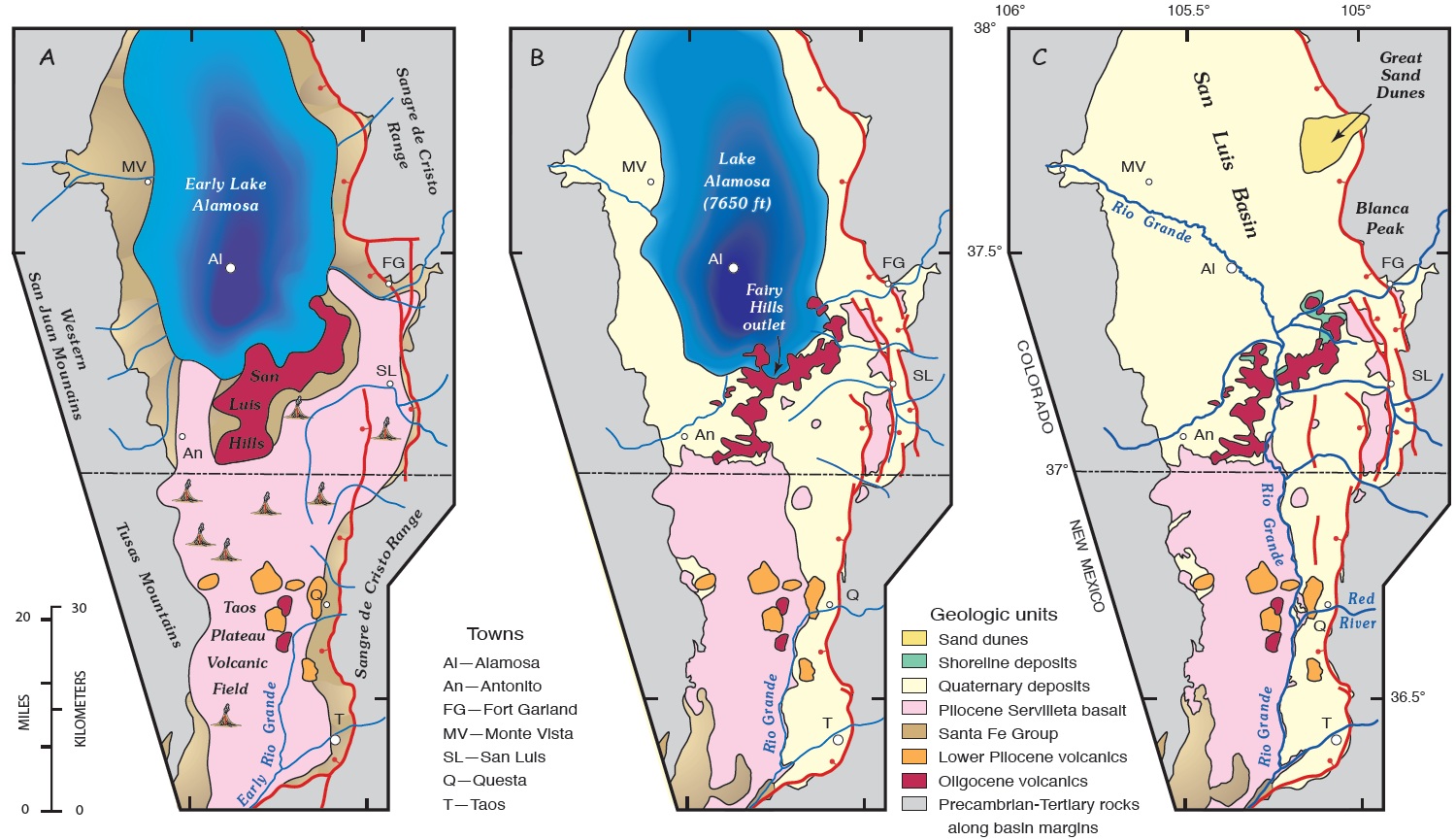 The following geologic map of the San Luis Basin shows the stages in Lake Alamosa’s three million-year expansion and eventual demise from 3.5 to 3 Ma (A), 440,000 ka (B) to the present (C). During the middle Pleistocene about 440,000 years ago, Lake Alamosa overtopped a horst block of Oligocene volcanic rocks (of San Juan volcanic field affinities) at the Fairy Hills outlet (B) within the San Luis Hills and emptied to the south carving a gorge on its way to the Rio Grande River.