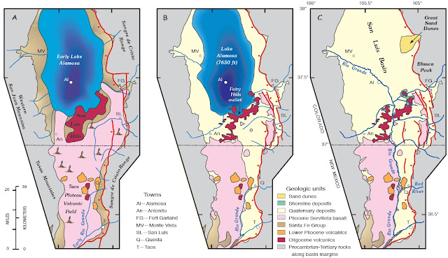 | A, Expansion of early Lake Alamosa; B, Lake Alamosa at its greatest expand before spillover; C, the basin of paleo-Lake Alamosa From Machette et al, 2007 |